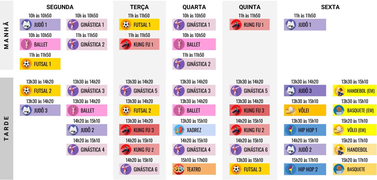 Clique sobre os ícones para obter mais informações, horários e turmas disponíveis para cada modalidade.
