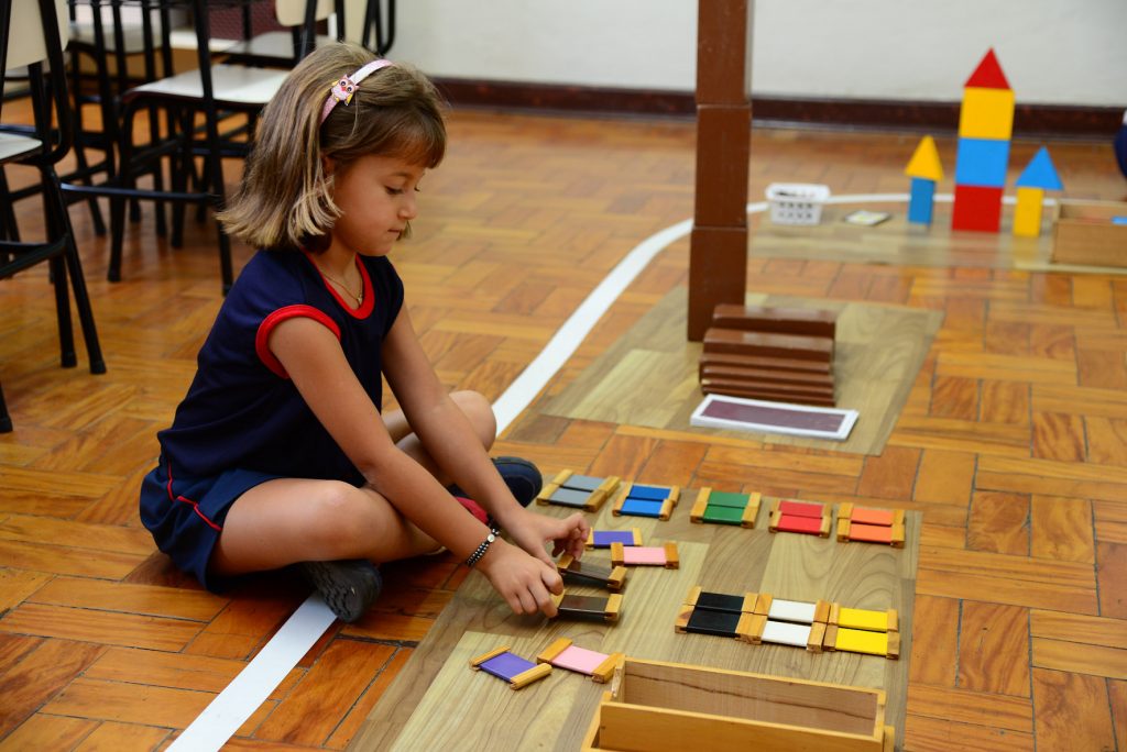 A aprendizagem parte de experiências concretas, através de materiais Montessorianos para favorecer a elaboração de ideias abstratas.